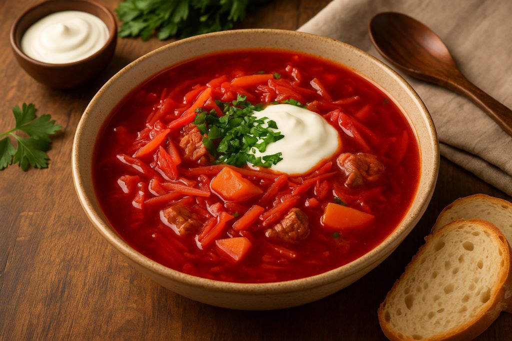 Борщ кубанский — это густой, ароматный и насыщенный суп, символ домашней кухни юга России. Он отличается обилием овощей, свежим вкусом и ярким цветом. На Кубани борщ традиционно готовят на говядине или свинине, с добавлением болгарского перца и помидоров.