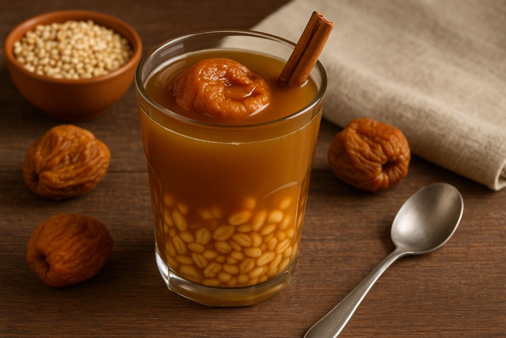 Подача. Подавайте охлаждённым, с кусочками персика и зерном — едят ложкой и запивают сладким отваром.