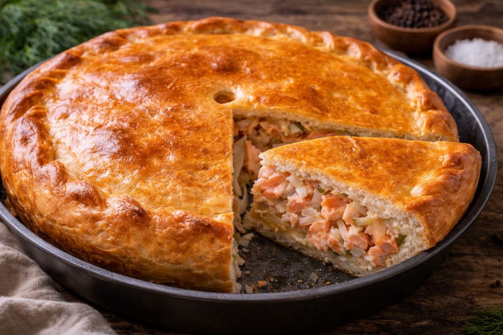Рыбный пирог с лососем — сытное и традиционное блюдо, которое часто готовят в регионах с богатым рыбным промыслом, включая Камчатку. Здесь такие пироги делают простыми, но насыщенными по вкусу: основа — мягкое тесто и сочная начинка из красной рыбы. Лосось при запекании остаётся нежным и пропитывает тесто ароматным соком.