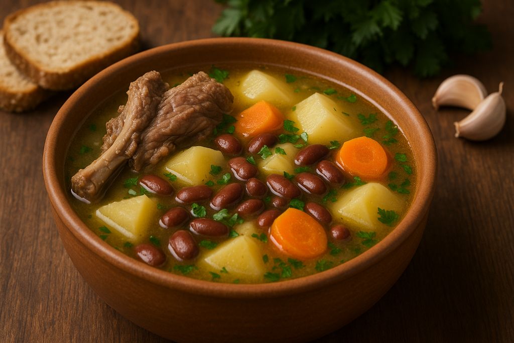 Суп из баранины с фасолью — одно из самых ароматных и сытных блюд осетинской кухни. Его любят за насыщенный бульон, мягкое мясо и густую, почти рагу-образную текстуру. В горах такой суп ценили всегда: он согревает, насыщает и готовится из доступных продуктов — баранины, фасоли и овощей.