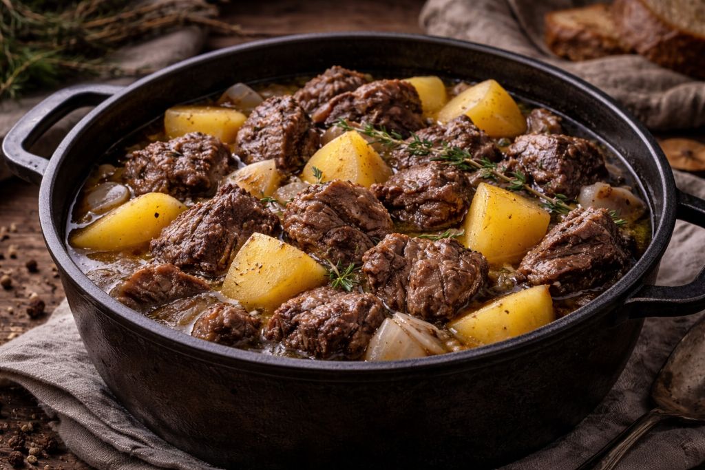 Оленина — мясо постное, плотное и насыщенное по вкусу. Чтобы оно получилось мягким, его долго тушат на слабом огне, часто с минимальным набором овощей. Картофель появился в северной кухне сравнительно поздно, но быстро прижился как удобный и сытный продукт. В домашнем варианте он служит нейтральным фоном, впитывающим мясной сок и аромат бульона.